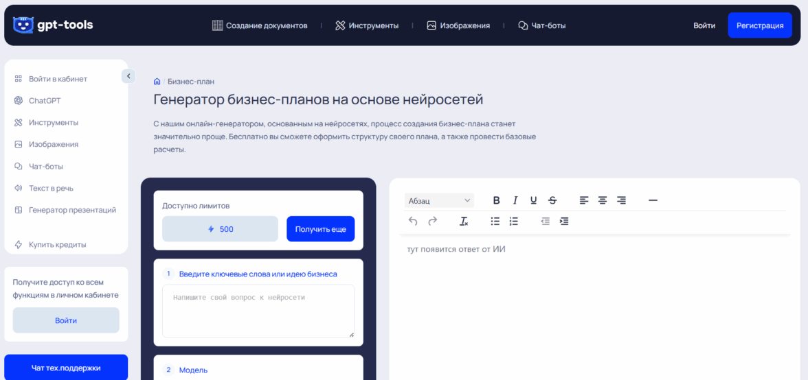 Нейросеть для написания бизнес-плана сильно ограничена в бесплатной версии.