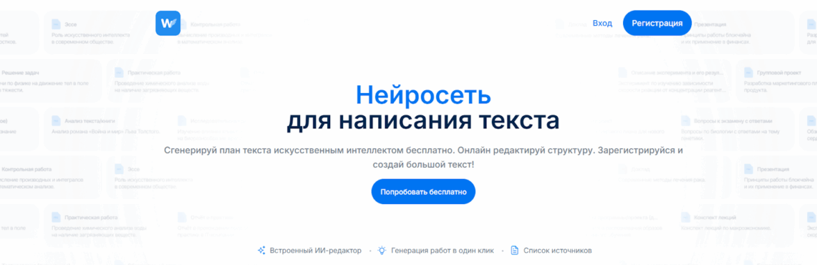 Русскоязычная нейросеть, которая пишет длинные тексты: рефераты, проекты, курсовые и ВКР по заданной теме. Сервис сначала бесплатно генерирует подробный план, а затем по нему создает полный текст с возможностью доработки. Встроенный ИИ‑редактор позволяет править главы, «разводить воду» и сразу выгружать результат в формате Word.