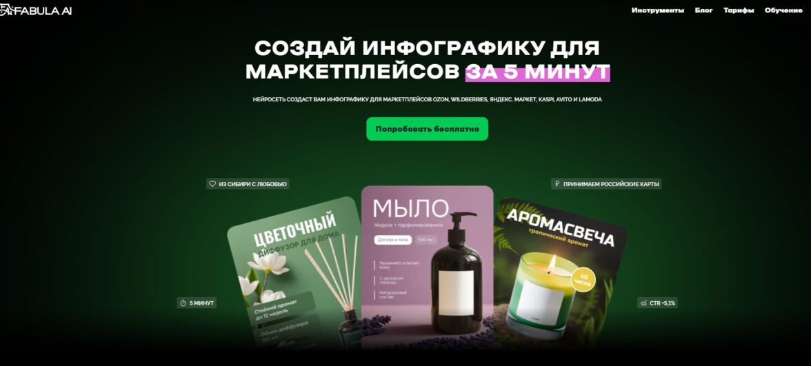 Нейросеть для автоматического создания продающих карточек товаров и инфографики для маркетплейсов вроде Wildberries, Ozon и Яндекс.Маркета. Сервис генерирует визуалы с автозаменой фона, подбором преимуществ продукта и адаптацией под требования площадок за минуты без дизайнеров.