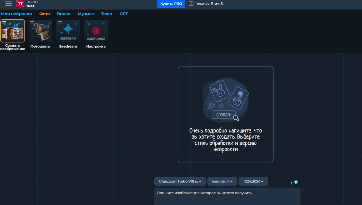 Гибкие настройки (разрешение, стиль, контраст, текст на картинке) и связка с другими ИИ‑инструментами TurboText (тексты, видео, фоторедактор).