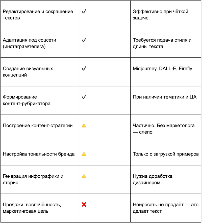 Они умеют: находить шаблоны; адаптировать стиль; ускорять рутину; тестировать формулировки; генерировать десятки вариаций, чтобы выбрать одну. Они не умеют: ставить цель; выстраивать стратегию; знать нюансы твоей ЦА;
