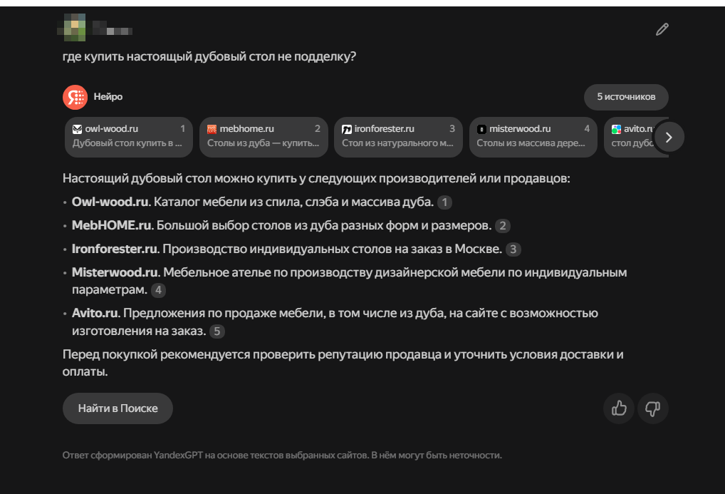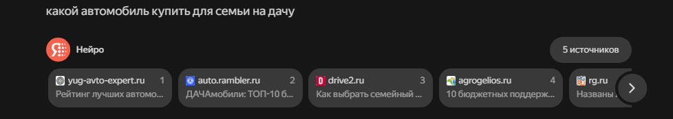 Это продукт, который в ответ на запрос подберет источники, проанализирует информацию из них, сгенерирует ответ. Актуальные ссылки на источники прилагаются. Пользователь может их просмотреть, переключиться на обычный поиск или уточнить запрос.