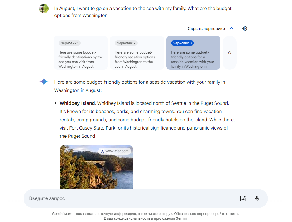 Модель генерирует три варианта ответа (черновики). Пользователь может просмотреть любой или обновить, чтобы получить новые ответы. Ссылки на источники проставлены только для изображений.