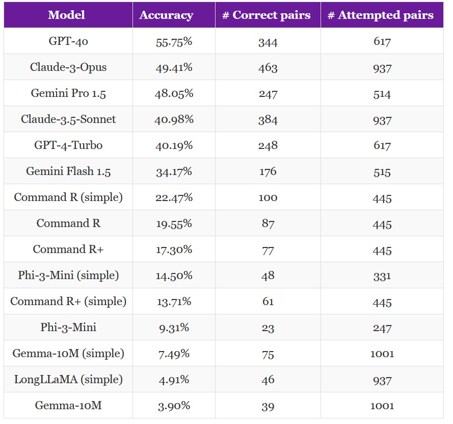 Лучший результат показала ИИ-модель GPT-40. Она дала правильные ответы в 344 парах из 617. Точность составила 55,75%. Только GPT-40 удалось преодолеть планку 50% (таким образом, ее показатель лишь немногим лучше, чем определение правильного ответа путем подбрасывания монетки).