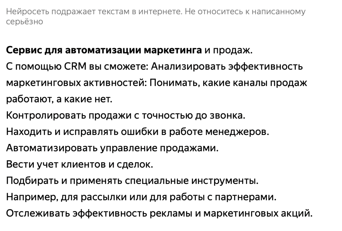 Балабоба — эта нейросеть генерирует текст на основе вводных и стилизует их под нужные форматы. Вот такой текст получится со словосочетанием «сервис автоматизации маркетинга».