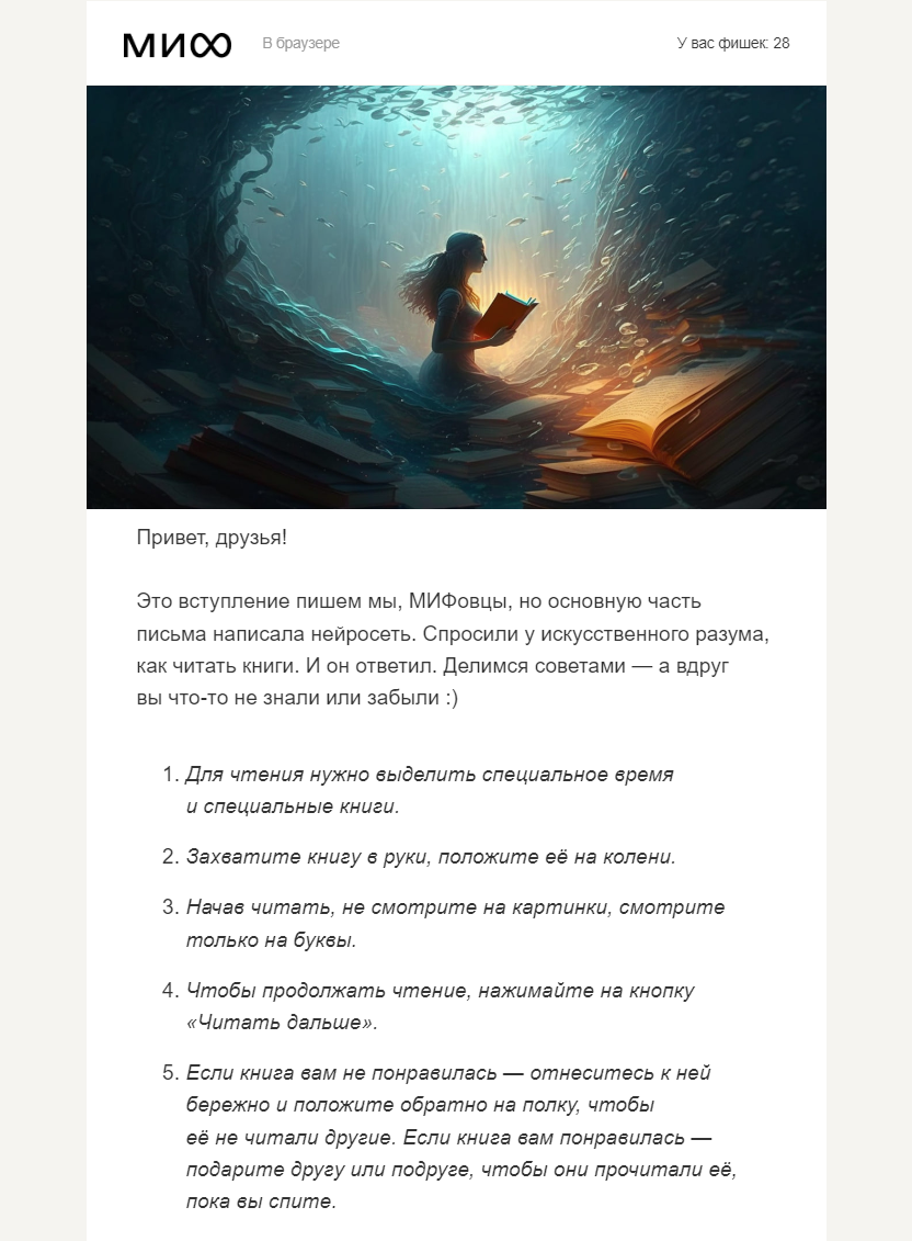 • Издательство «МИФ» практикует в email-рассылках сообщения, написанные нейросетью.