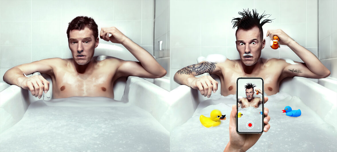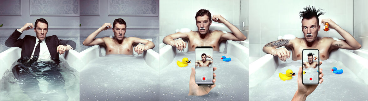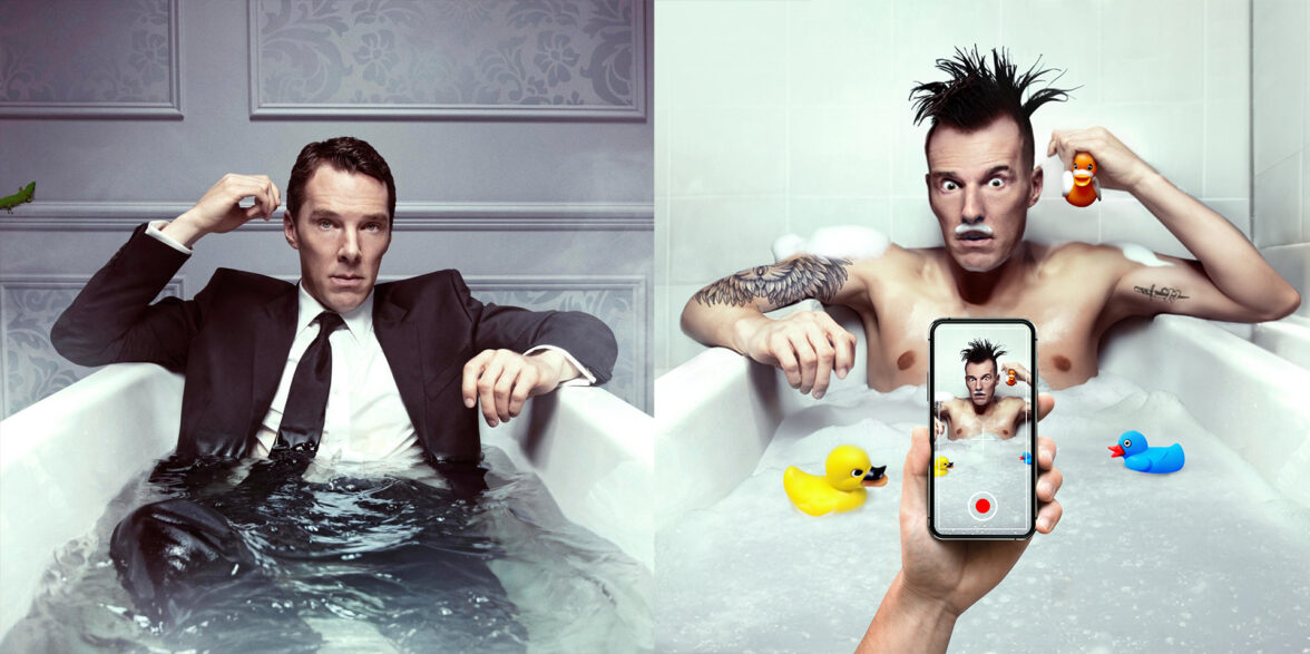 В креативе с ванной, все смотрится пустовато, плюс нам нужно усилить контраст между брутальностью панка и приватностью момента. Поэтому решаем, что он будет играть с уточками, а уже с помощью нейросети воспроизводим их в макете. Плюс брутальности мужчине явно придадут татуировки: добавляем их уже через классическую ретушь. Получается, что креатор думает над идеей — как усилить момент через противоречие брутальности и инфантильности, а нейронка помогает ему это реализовать и быстро перебирать варианты для поиска наилучшего решения.
