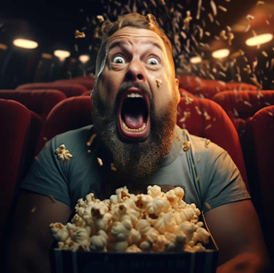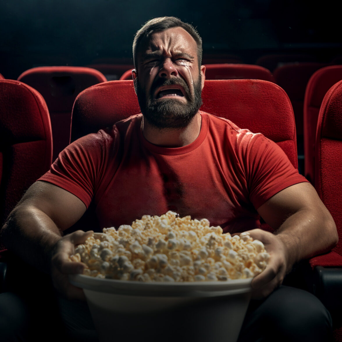 brutal bearded man crying in the empty cinema, eating popcorn, lens 20 mm, shocked face, photorealism, detailed facial, global illumination.
