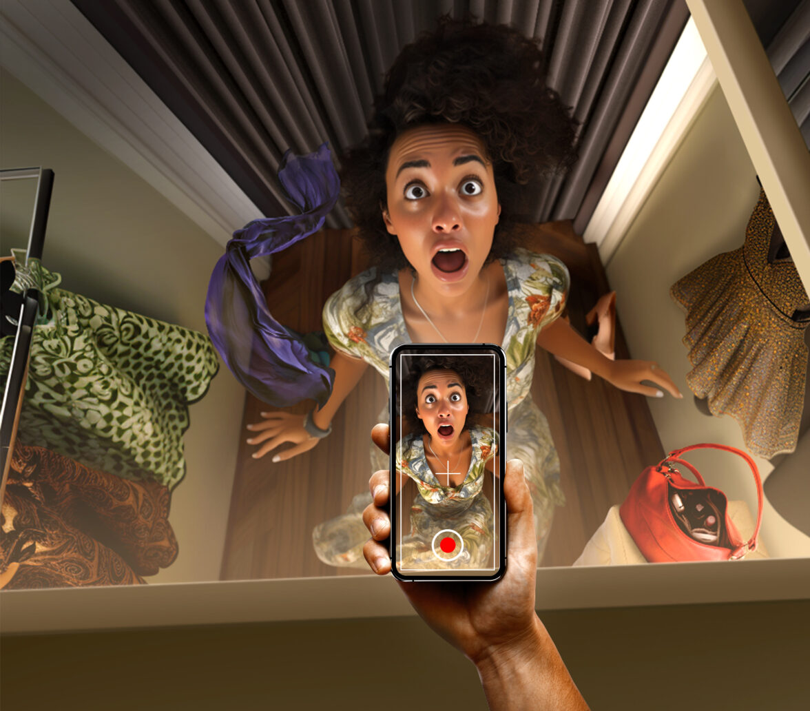 Ниже пример сюжета, где за героиней следят в примерочной. Широкоугольный объектив со специфической световой схемой — лишь несколько из условий, чтобы подобный кадр вышел удачным. А с помощью нейросети мы можем сгенерировать множество подобных кадров и затем немного обработать их в Photoshop. Нам достаточно добавить в промпт фразу lens 5mm (линза 5 мм) или fish eye (эффект рыбьего глаза), и мы получим тот же эффект, что и у широкоугольного объектива.