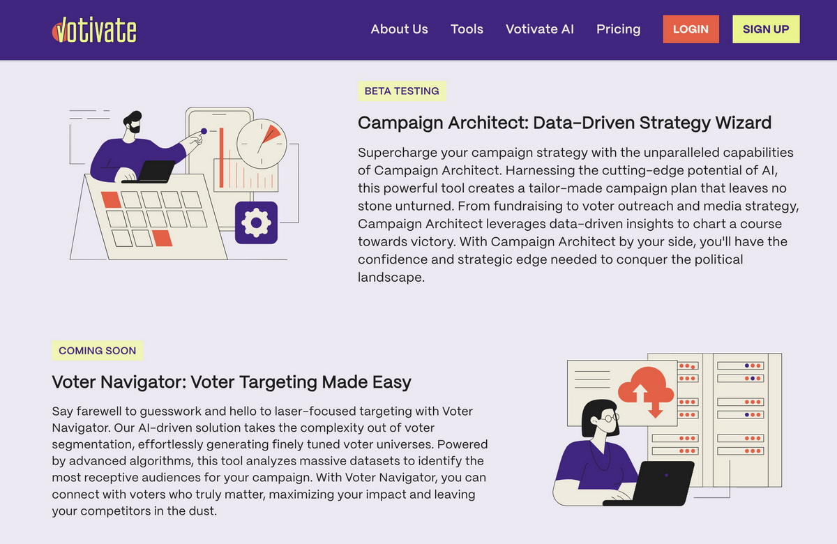 Работающие на Джейсона Палмера политтехнологи — не единственные, кто поверил в эффективность применения ИИ в политических кампаниях. В феврале издание The Nation написало о компании Votivate, разрабатывающей одноименный набор ИИ-инструментов для политтехнологов и общественных организаций. VotivateAI состоит из нескольких компонентов. Первый — Campaign Architect — облегчает работу штаба, генерируя подробную стратегию на основе данных о кампании (уровень выборов, доступный объем финансирования, демографические параметры избирателей и др.).