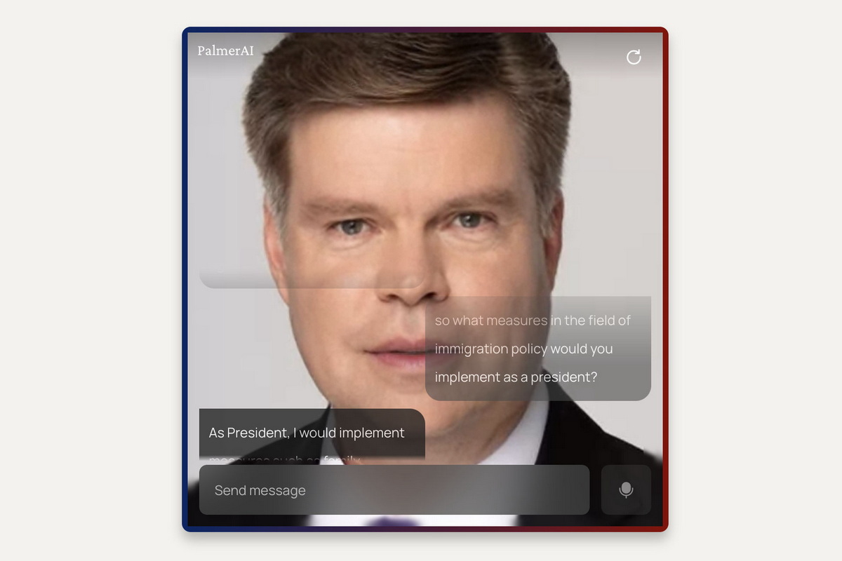 В нижнем правом углу каждой страницы сайта политика была размещена кнопка Palmer.AI. По нажатию на нее на экране возникает анимированный портрет Палмера и окошко для ввода текста, который можно набирать с клавиатуры или использовать голосовой ввод. Чат-бот отвечает после 5-10 секунд раздумий, одновременно текстом и голосом, который идентичен голосу политика и звучит довольно естественно. Для его генерации тоже использовали нейросеть, которую обучили на нескольких часах записей выступлений кандидата.