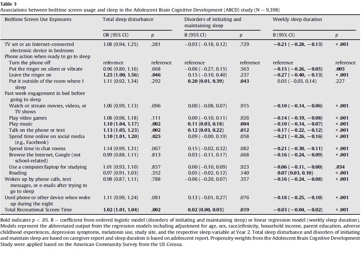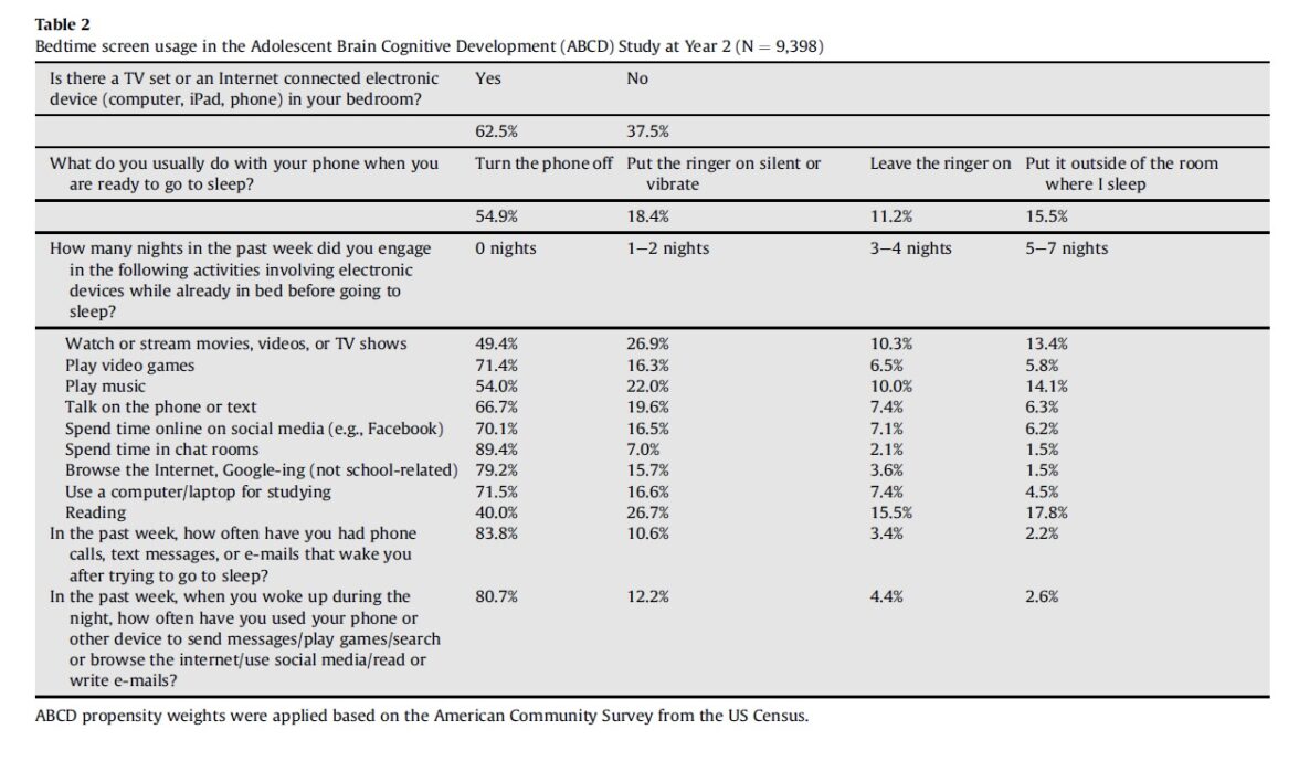 Между экранным временем перед сном и нарушениями сна обнаружилась прямая взаимосвязь. Выяснилось, что на третьем году исследования меньшая продолжительность сна была практически у всех подростков, кроме тех, которые перед сном оставляли телефон в другой комнате, и тех, кто в кровати читал. Сильнее всего сокращала сон привычка выходить в интернет или пользоваться соцсетями перед отходом ко сну.