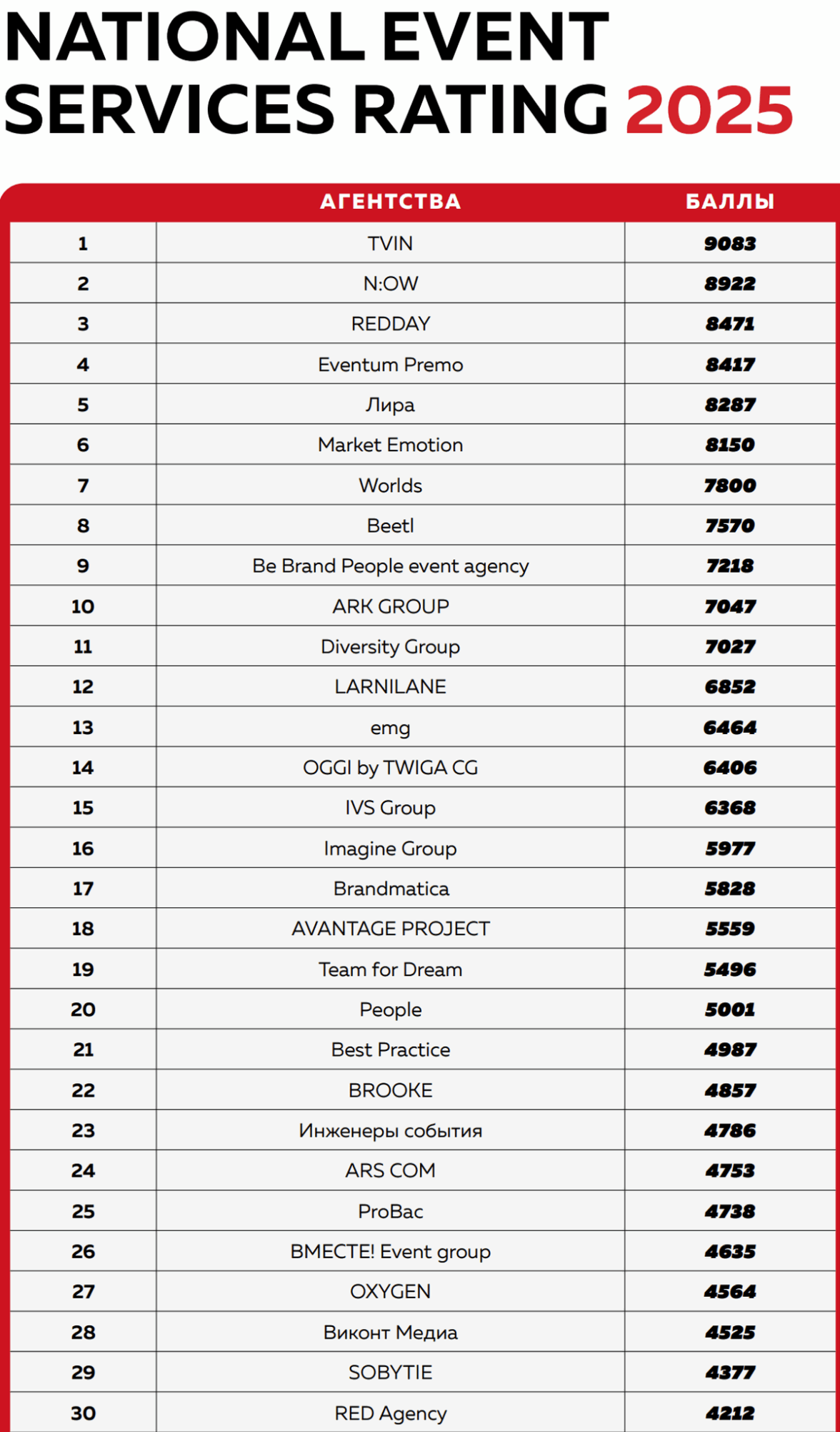 Победитель прошлого года — агентство Eventum Premo, несмотря на то что набрало больше баллов, чем год назад (8417 против 7287), занимает теперь четвертую строку. Агентство Лира (в 2024 году — LYRA DESIGN&EVENT) — 4-е место прошлогоднего рейтинга, в этом году замыкает топ-5 с 8287 баллами (6466 баллов годом ранее).