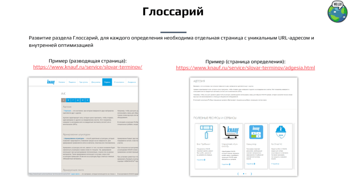Улучшение видимости в поисковых системах. Каждое определение — это отдельная страница, оптимизированная под конкретные ключевые слова. Это увеличивает количество входящих запросов и привлекает дополнительный трафик. А также сильно расширяет запросный индекс.