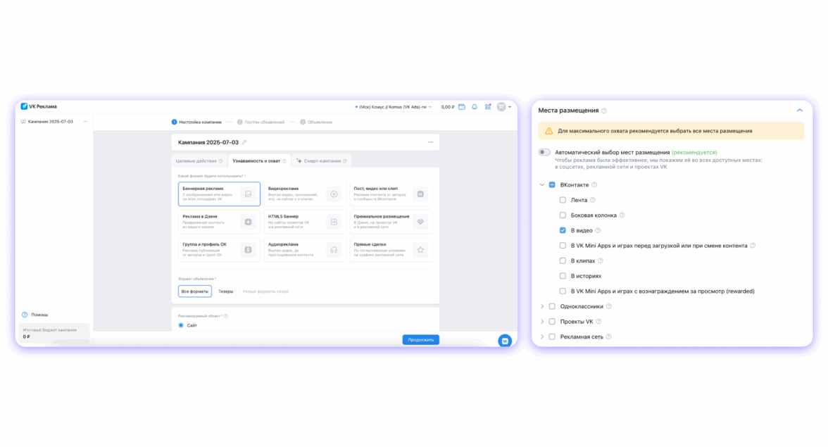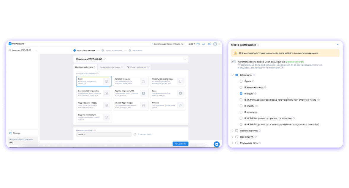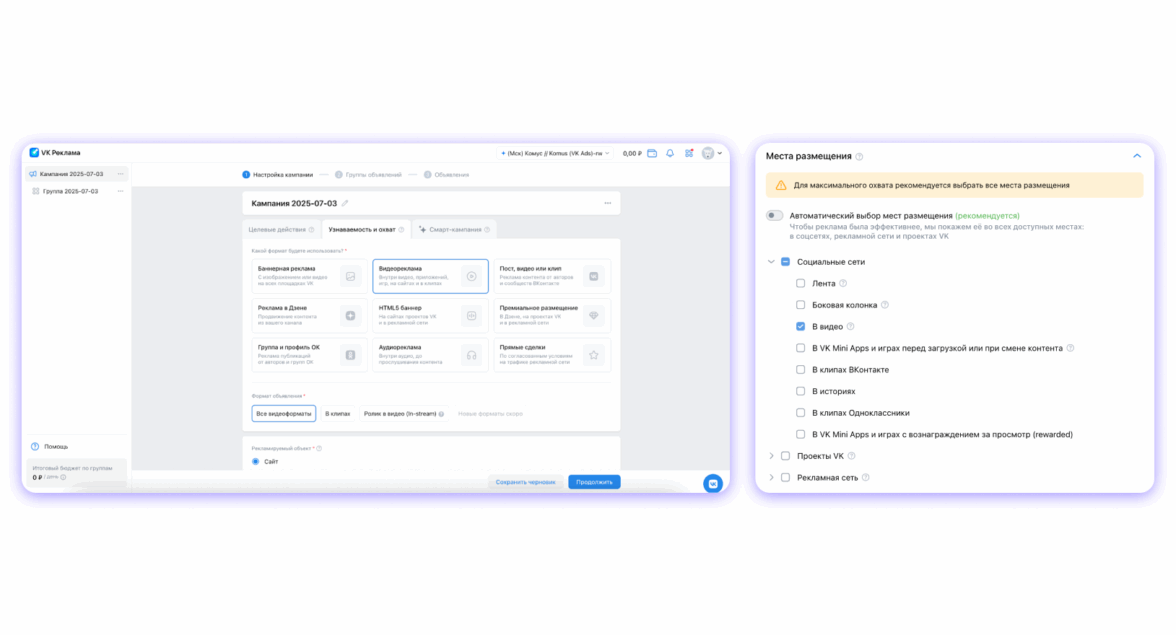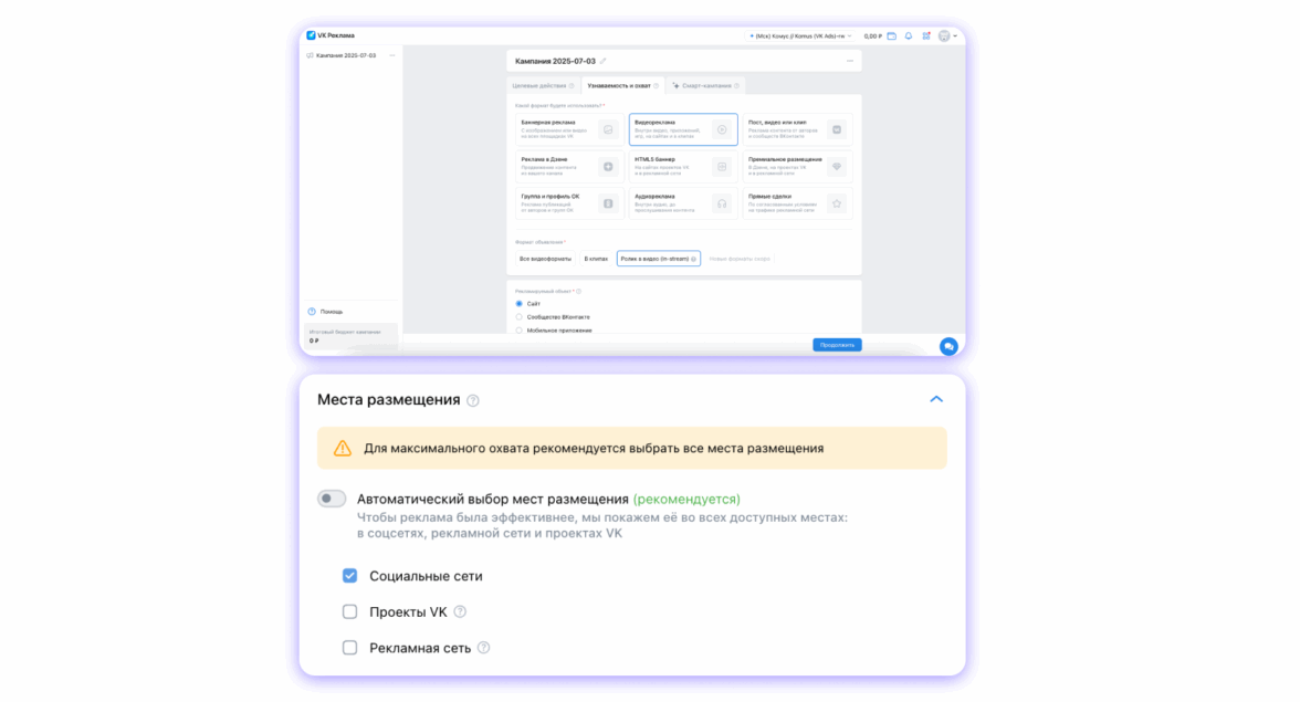 Чтобы креатив появлялся именно внутри роликов, нужно выбрать в местах размещениях «Видео в соцсетях».