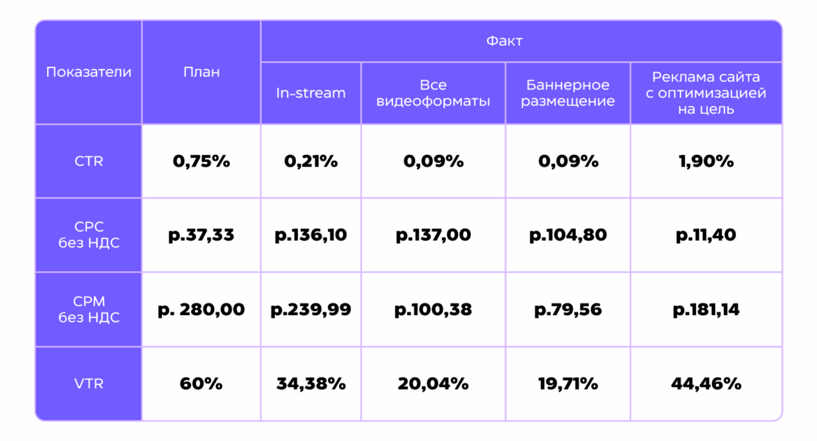 Лучше всего показала себя кампания с оптимизацией на цель. Если сравнивать со стандартным in-stream, нам удалось снизить CPM на 25% до 180 рублей и при этом получить CTR выше в 9 раз, а VTR — на 10%.