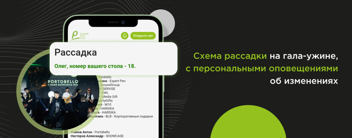 Далее пришёл черёд и персонализации. «Схема рассадки» в её традиционном виде — полезна лишь при небольшом количестве участников. Когда столов больше десяти, участнику быстрее разобраться на месте, чем вчитываться в схему на маленьком экране. Но если сообщить каждому участнику персонально, желательно крупными буквами 😊 — «Татьяна, номер Вашего стола — 19», то это сведёт замешательство на входе на гала-ужин к нулю. Мелочей не бывает, гласит один из наших принципов. Вернее, из таких мелочей и складывается позитивный имидж мероприятия и яркие эмоции от участия. А гала-ужин, кстати, вышел прекрасным, как и остальная программа.