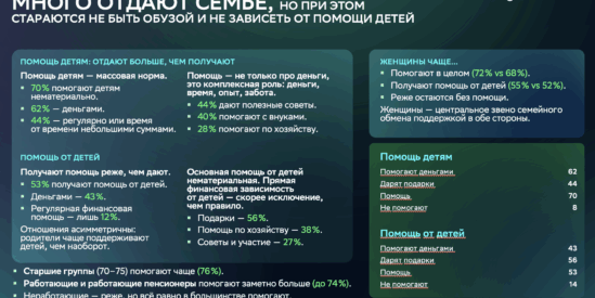 При этом старшее поколение старается не быть обузой и предпочитает поддерживать детей, а не зависеть от них. Финансовую помощь от детей получают лишь 43%, и только 12% из них — на регулярной основе.