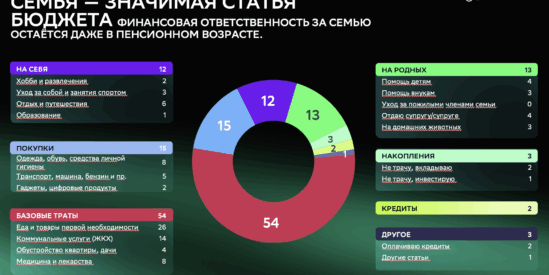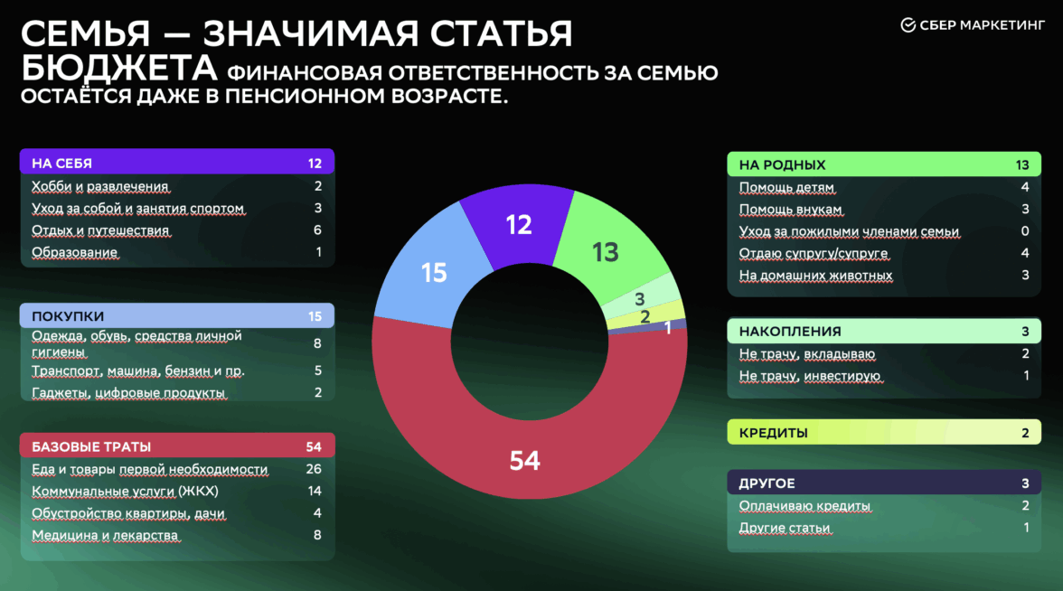 Чем выше ответственность за близких, тем ниже доля расходов на личные нужды. Структура потребления определяется ролью человека внутри семьи, а не возрастом как таковым. В среднем на помощь родным люди старше 55 лет выделяет около 13% бюджета. Базовые траты — еда, лекарства, ЖКХ и товары первой необходимости — «съедают» от него 54%, на различные покупки уходит 15%, на себя — 12%.