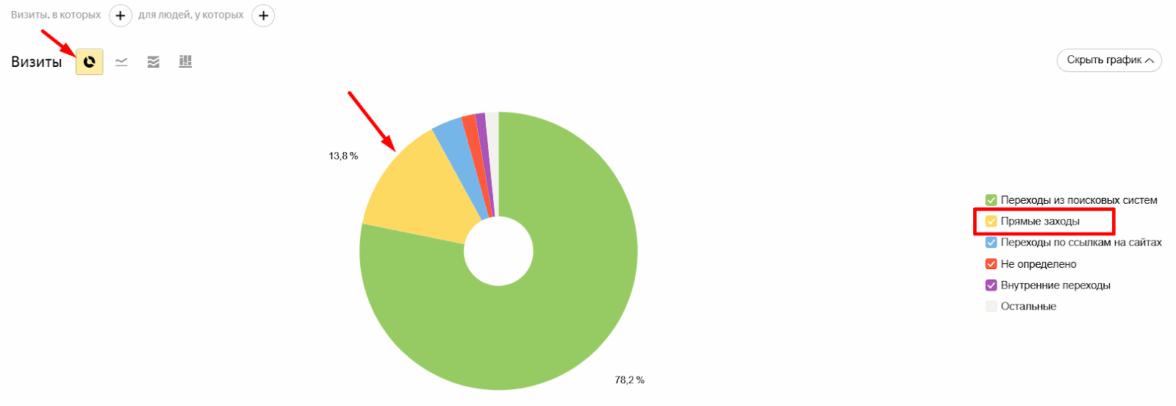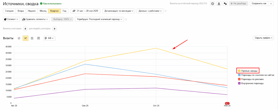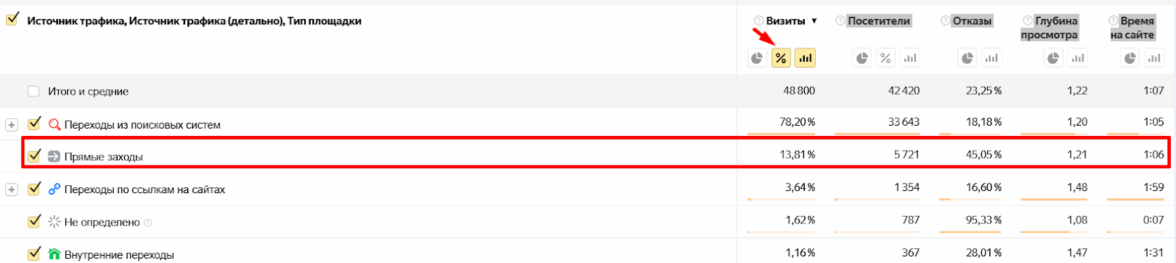 Важно не только абсолютное количество визитов, но и доля прямого трафика среди всех источников.