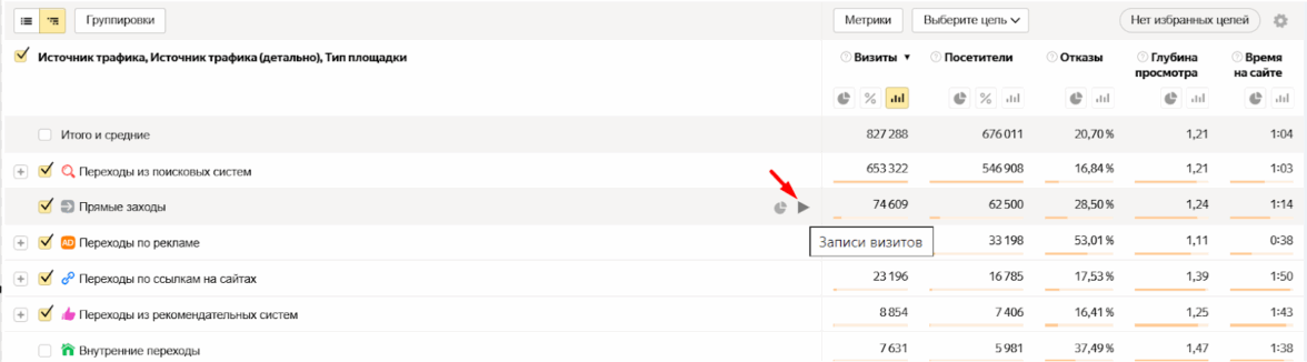 Как открыть записи: в отчёте «Источники, сводка» наведите курсор на «Прямые заходы» и нажмите «Записи визитов». Вы увидите: