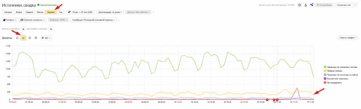 Как смотреть: откройте «Источники» → «Источники, сводка» и переключите график на линейный формат или гистограмму. Плавная линия изменений снижает вероятность проблем с UTM-разметкой или потерей данных.
