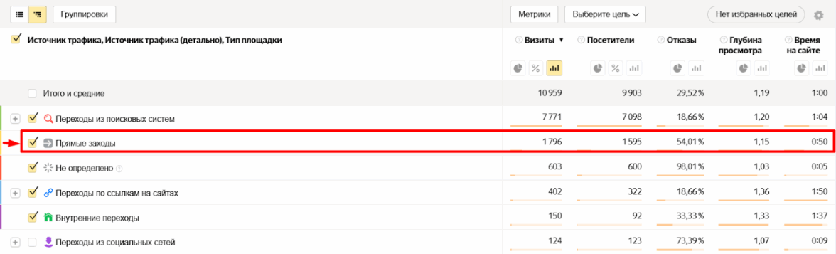 В таблице отображаются все каналы трафика. Выберите строку «Прямые заходы» и система покажет показатели именно по этому источнику.
