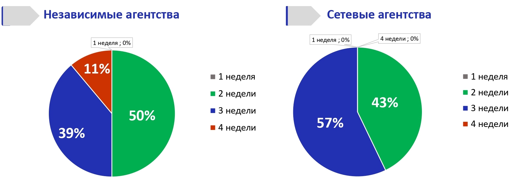 Заказывая креатив в независимом агентстве, клиент может получить результат немного быстрее, чем при работе с сетевиками. По данным исследования АКАР, средний срок разработки креативной идеи у 50% независимых компаний составил две недели, в то время как у сетевиков этот показатель достиг 43%. Правда, 11% опрошенных независимых агентств справляются с такой задачей за четыре недели. Сетевики, между тем, утверждают, что у них подобная работа занимает не больше трех недель.