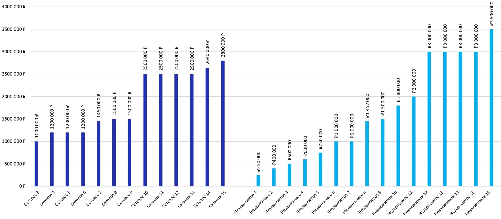 Среднее минимальное значение при этом в независимых агентствах составило 1,03 млн, а среднее максимальное — 2,28 млн рублей. В сетевых агентствах средняя минимальная цена этой услуги — 1,21 млн, средняя максимальная — 2,6 млн рублей. По мнению Пишванова, большой разброс может говорить об отсутствии «единых стандартов индустрии, связанных с методологией производства того или иного креативного продукта».