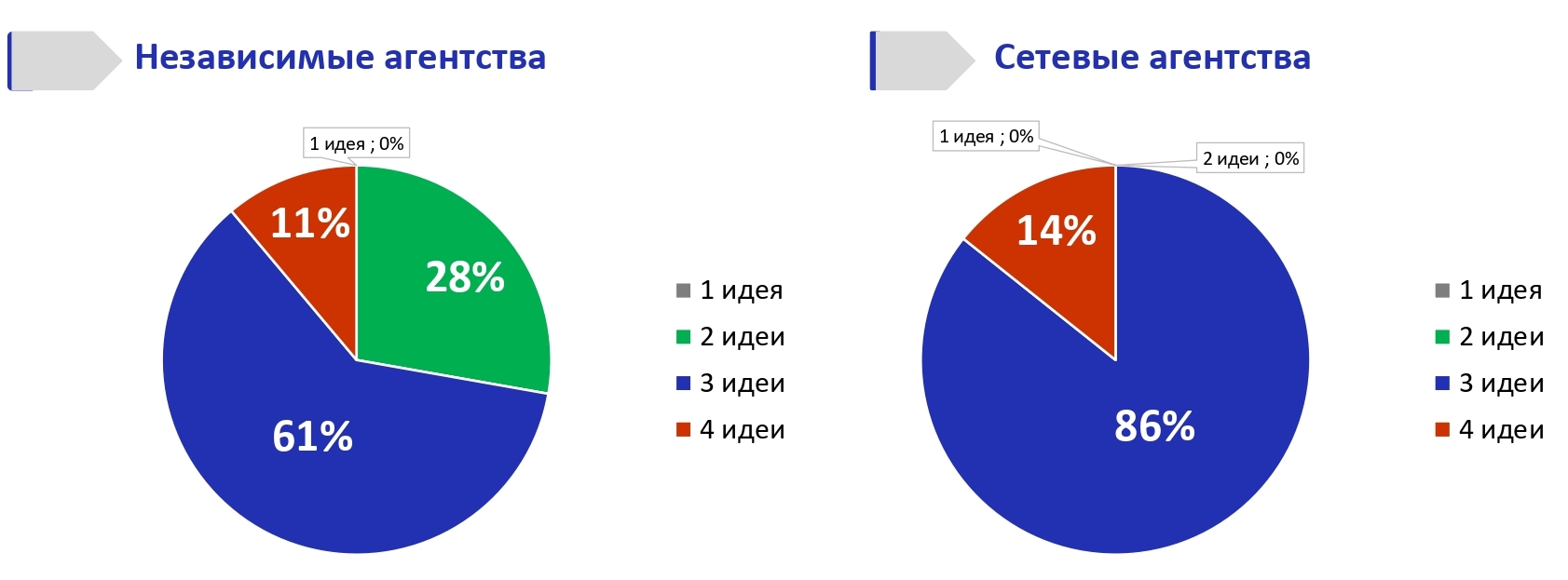 Сетевые агентства при работе над проектом презентуют клиентам в среднем больше вариантов креативных идей, чем независимые. Так, у 86% сетевиков речь идет о трех идеях, у 14% — о четырех. Среди независимых агентств три идеи обычно предлагает только 61% опрошенных, четыре идеи — 11% и две идеи — 28%.