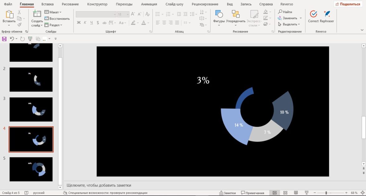 13. Делаем все то же, что и в предыдущем пункте, но смещаем числовые значения на сами секторы. При этом число, связанное с новым сектором на каждом слайде остается рядом с диаграммой. Так мы сможем дополнительно выделить это значение.