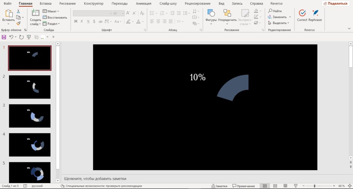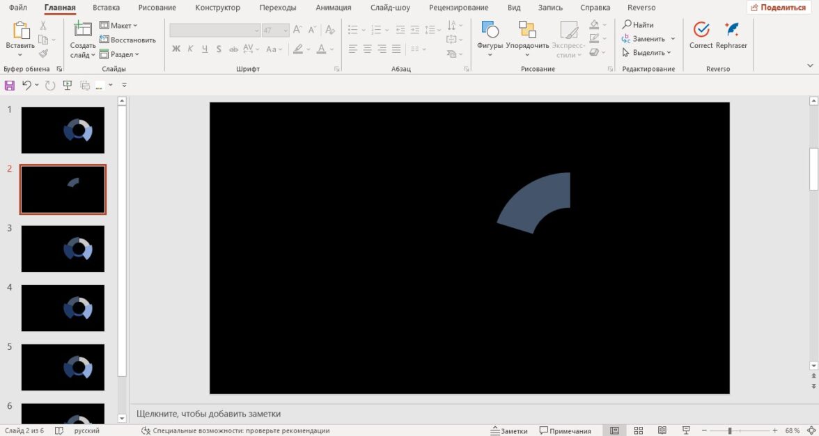 11. Далее начиная со второго слайда разворачиваем фигуру таким образом, чтобы новый сектор находился в левом верхнем углу, как бы замещая предыдущий элемент и смещая всю цепочку вперед.