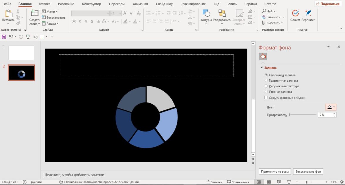 Если вы хотите изменить цвет фона, то нажмите правой кнопкой мыши по слайду и нажмите на кнопку Формат фона. В появившемся окне вы увидите функцию заливки фона, выберите нужный цвет. В данном случае мы использовали не стареющую классику — черный цвет.