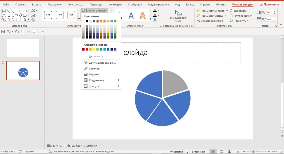 5. Выбираем каждый сектор по отдельности и выкрашиваем в нужные цвета. Для этого в верхней панели находим Формат фигуры ➝ Заливка фигуры ➝ выбираем нужный цвет.