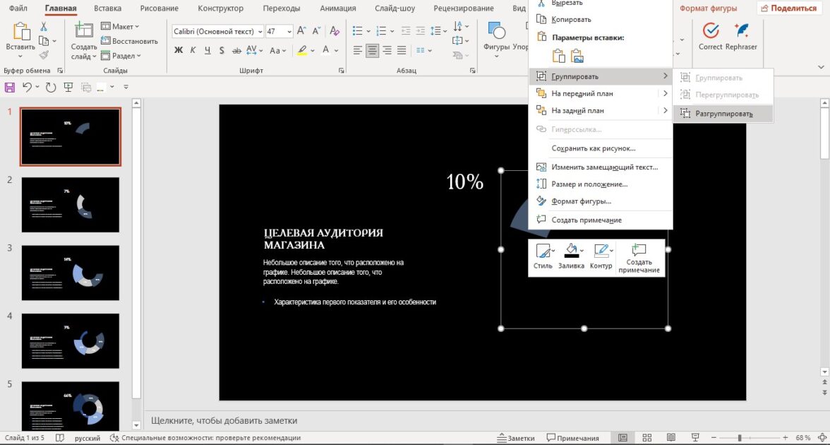16. Теперь на каждом слайде нужно разгруппировать фигуру: нажимаем правой кнопкой мыши на фигуру ➝ Группировать ➝ Разгруппировать.