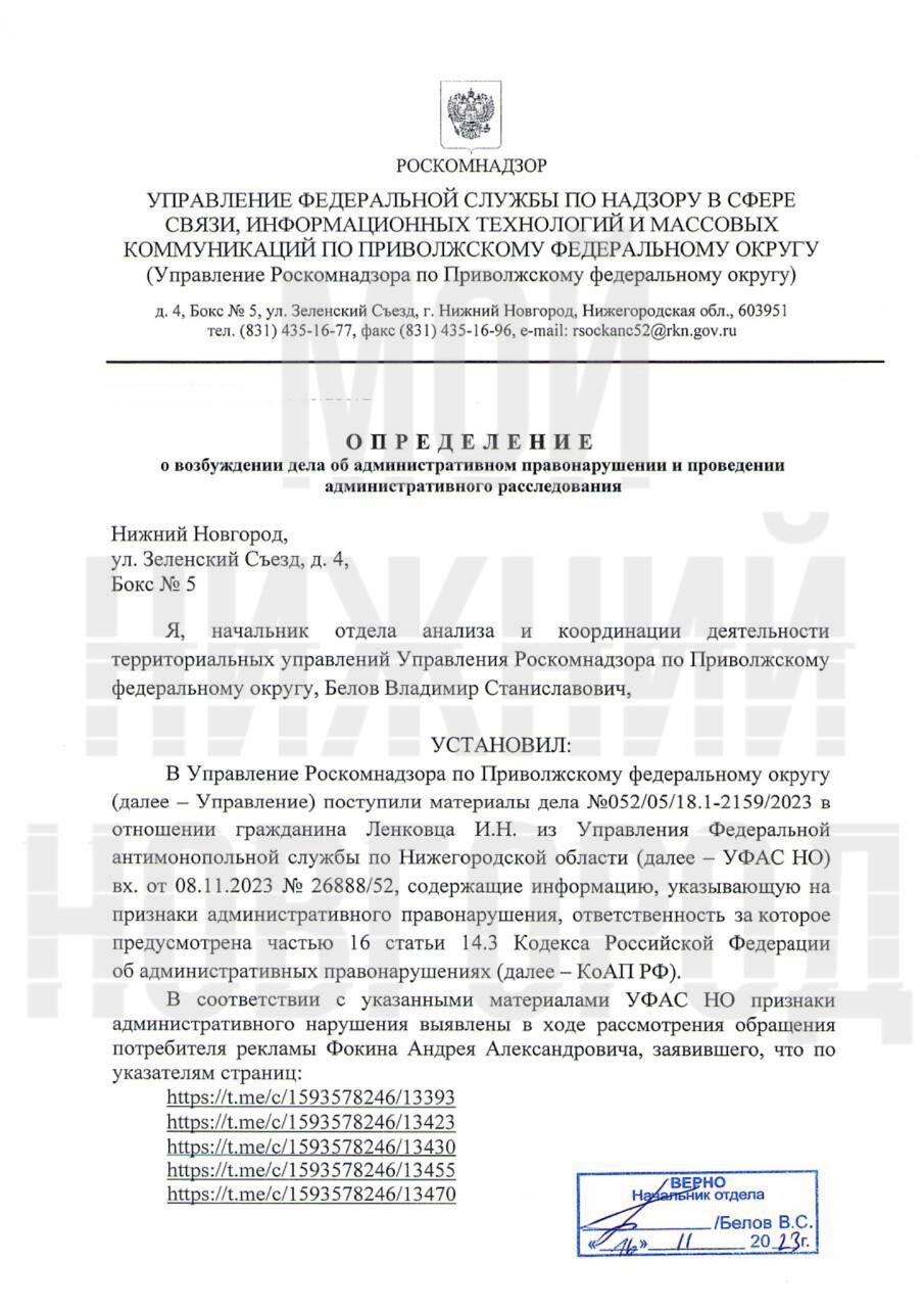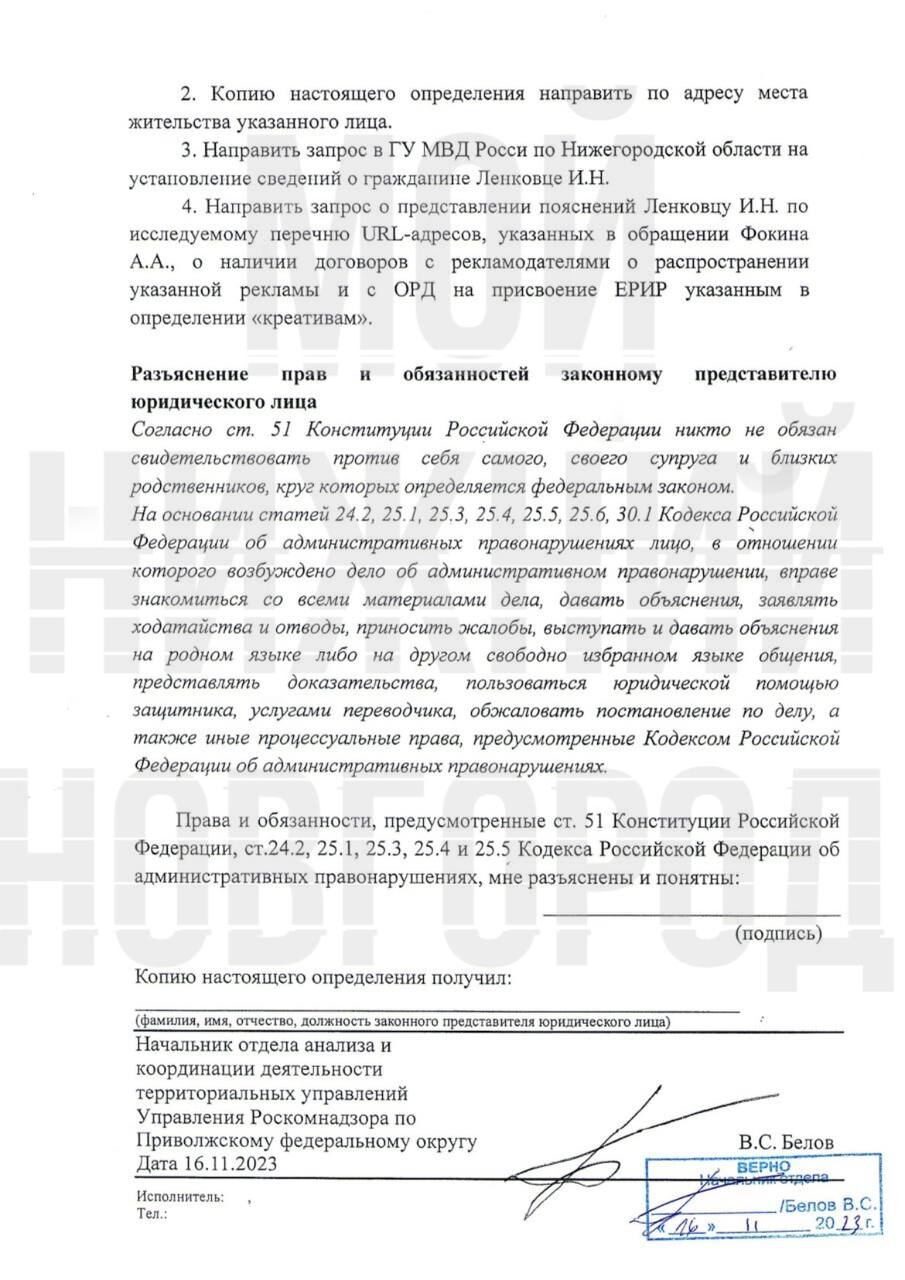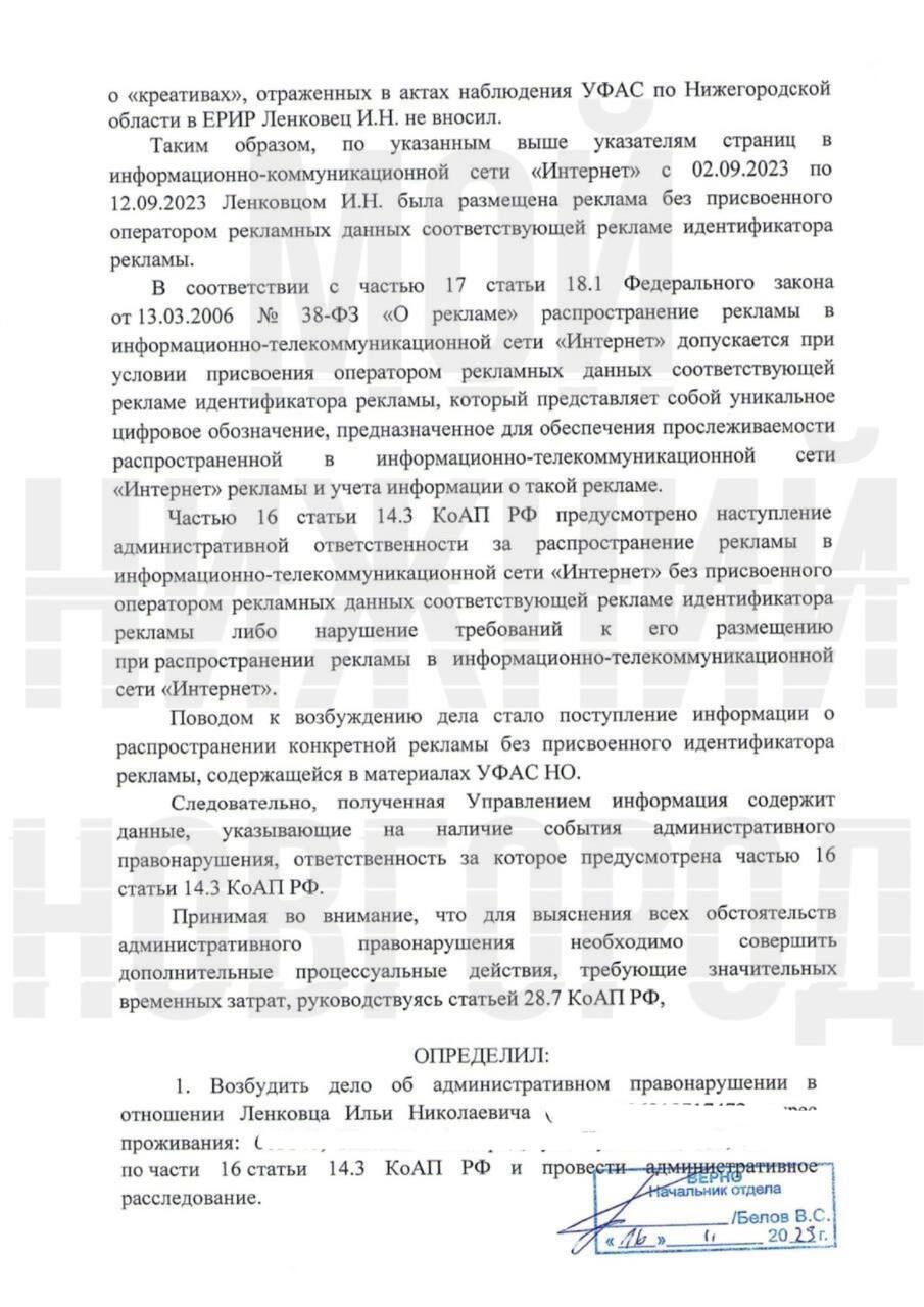 Как и предполагалось, после ФАС против паблика Мой Нижний Новгород (нижегородский кейс) возбудило дело Роскомнадзор по административному протоколу в связи с отсутствием маркировки рекламы (erid) и отчетности в ОРД, где штрафы для участников рекламной цепочки будут более существенные.