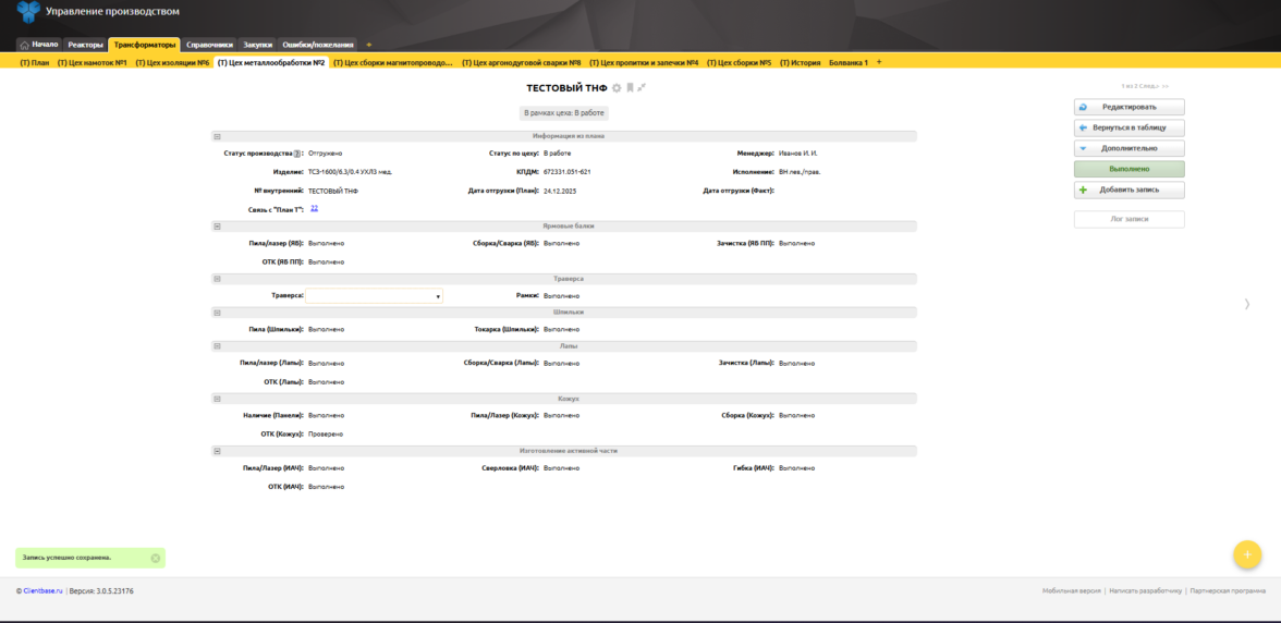 Решение Андрея: он не стал искать готовую «коробку» или писать систему с нуля, что потребовало бы команды разработчиков и больших сроков. Вместо этого он использовал «Клиентскую базу» как цифровой конструктор Лего для бизнес-процессов.— У каждого продукта — свой маршрут по цехам: металлообработка, покраска, установка катушек. Мы создали для каждого цеха свою рабочую область с задачами. А внутри задачи — чек-лист с подпроцессами, — объясняет архитектуру Андрей. — Рабочий просто ставит галочку «сделано сегодня», а система фиксирует время и даёт всем понимание, где «затык».