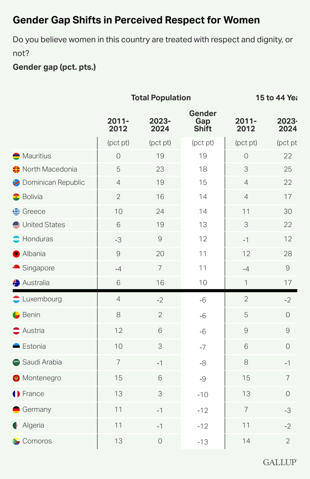 Кроме США за те же 13 лет разрыв между мнениями мужчин и женщин в вопросе женского равноправия увеличился на Маврикии (он составляет 19 процентных пунктов), в Северной Македонии (18), Доминиканской Республике (15), Боливии и Греции (по 14), в Гондурасе (12), Албании (11), Австралии (10).