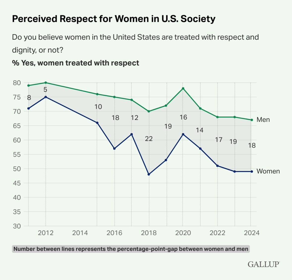 Опрос Gallup показал, что Соединенные Штаты выделяются на общемировом фоне постепенным ухудшением отношения к женщинам. За последние 13 лет уменьшилось число американцев, считающих, что к женщинам в их стране относятся с достоинством и уважением. Кроме того, увеличился разрыв между тем, что думают о равноправии мужчин и женщин представители разных полов. В 2011 году 79% американских мужчин и 71% американских женщин признавали уважительное отношение к женщинам. Разрыв в восприятии между представителями двух полов в 2011 году составлял 8 процентных пунктов. В 2012 году — всего 5. В 2024 году только около двух третей (67%) мужчин заявляют об уважительном отношении к женщинам, а среди женщин такого мнения придерживаются чуть меньше половины (49%). Разрыв составляет уже 18 процентных пунктов (в 2023 году — 19).