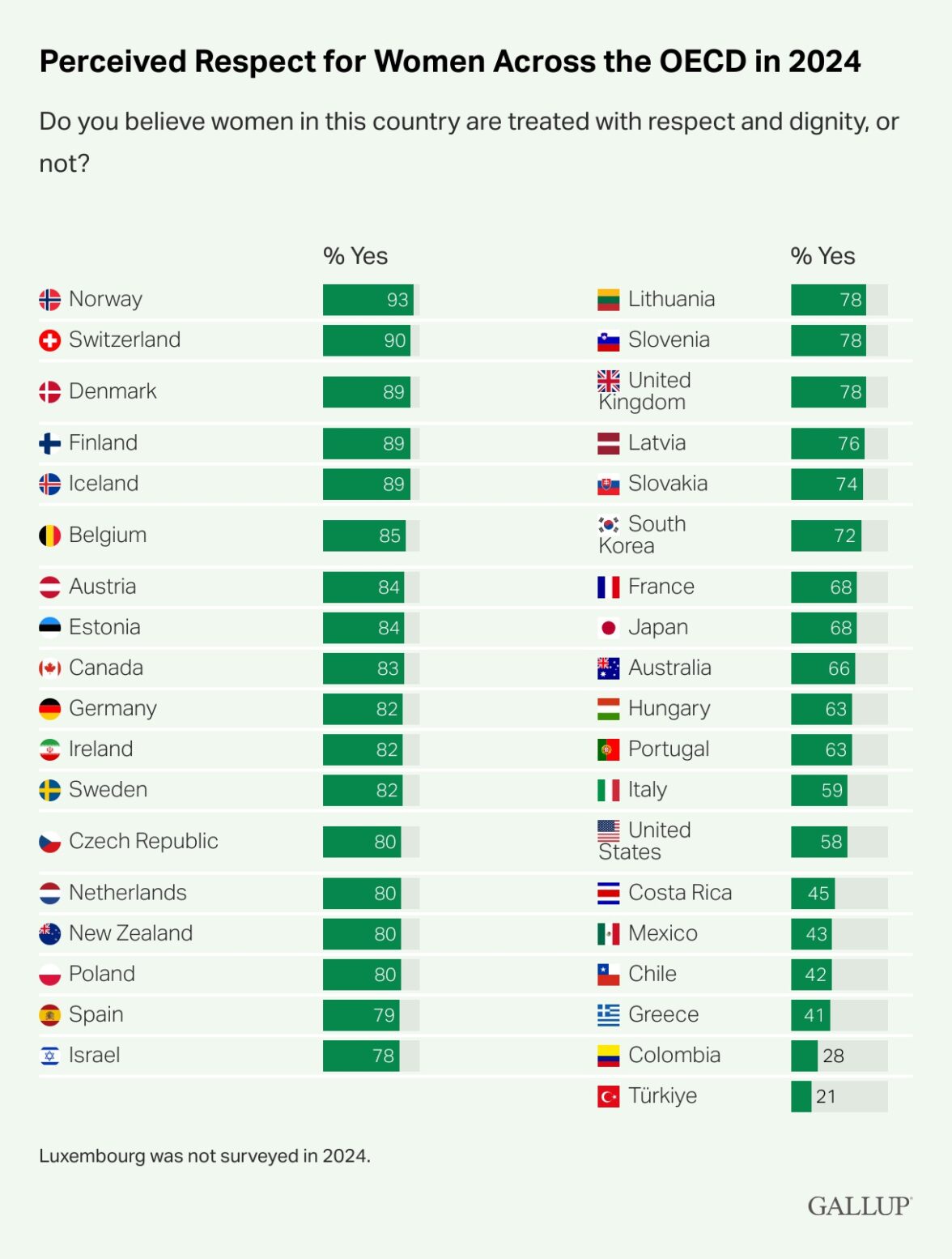 В развитых странах, входящих в Организацию экономического сотрудничества и развития (ОЭСР), на вопрос «Считаете ли вы, что к женщинам в этой стране относятся с уважением и достоинством или нет?» больше всего положительных ответов дали жители Норвегии — 93% опрошенных в этой стране.