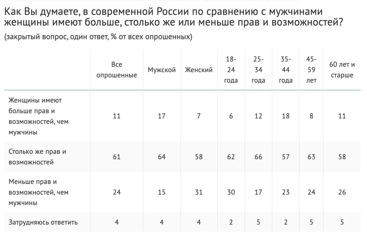 Разрыв во мнениях между мужчинами и женщинами по вопросу о положении женщин в обществе существует. О равенстве полов заявили 64% мужчин и 58% женщин. Разрыв — 8 процентных пунктов. О том, что у женщин больше прав и возможностей, сказали 17% мужчин и 7% женщин. Разрыв — 10 процентных пунктов. Среди 18–24 летних выше всего доля тех, кто считает, что у российских женщин меньше прав и возможностей по сравнению с мужчинами — 30%. В равенство полов больше всего верят 25–34-летние — 66%. Среди 35–44-летних больше всего тех, кто верит в преимущество женщин — 18%.