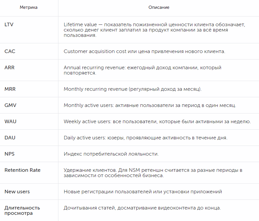 Это показатели, связанные с деньгами (LTV, CAC, ARR, MRR, GMV и так далее), вовлечённостью (DAU, WAU, MAU), а также NPS, количество новых пользователей, дочитывание контента и другие. Чтобы найти «полярную звезду», придётся определить ценность продукта и понять, как её отслеживать в числовом показателе. Также важно, чтобы North Star соотносилась с целями и задачами всех отделов компании.