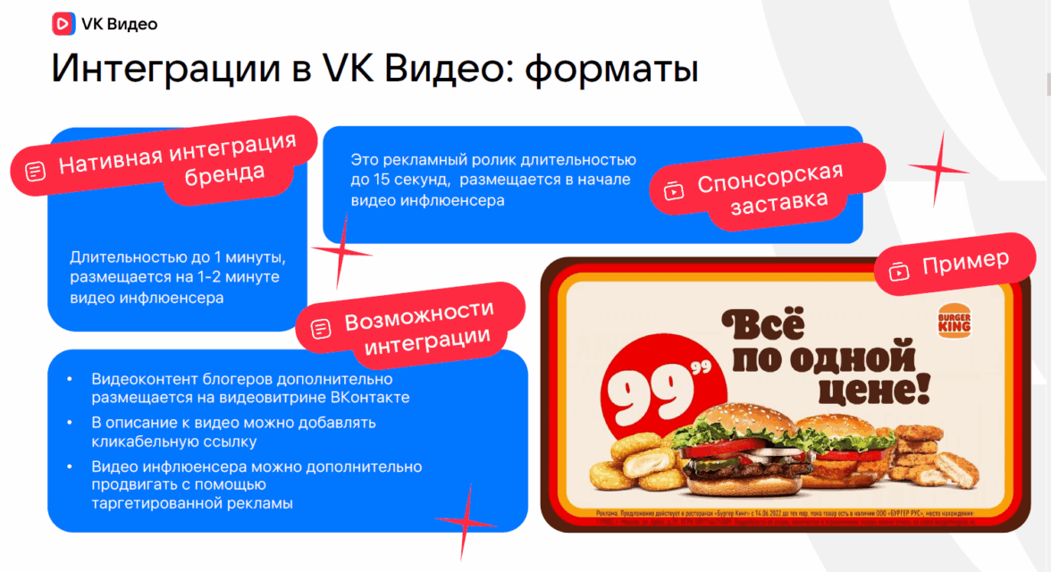 Спецпроекты. Крупным проектам VK Видео предлагает комплексное продвижение с участием инфлюенсеров и привлечением других активов VK. В видеоконтент (VK Клипы, VK Видео) можно включить нативные минутные интеграции, заставки pre-roll и mid-roll до 20 сек. Реклама также может появляться в шоу от Medium Quality Production.