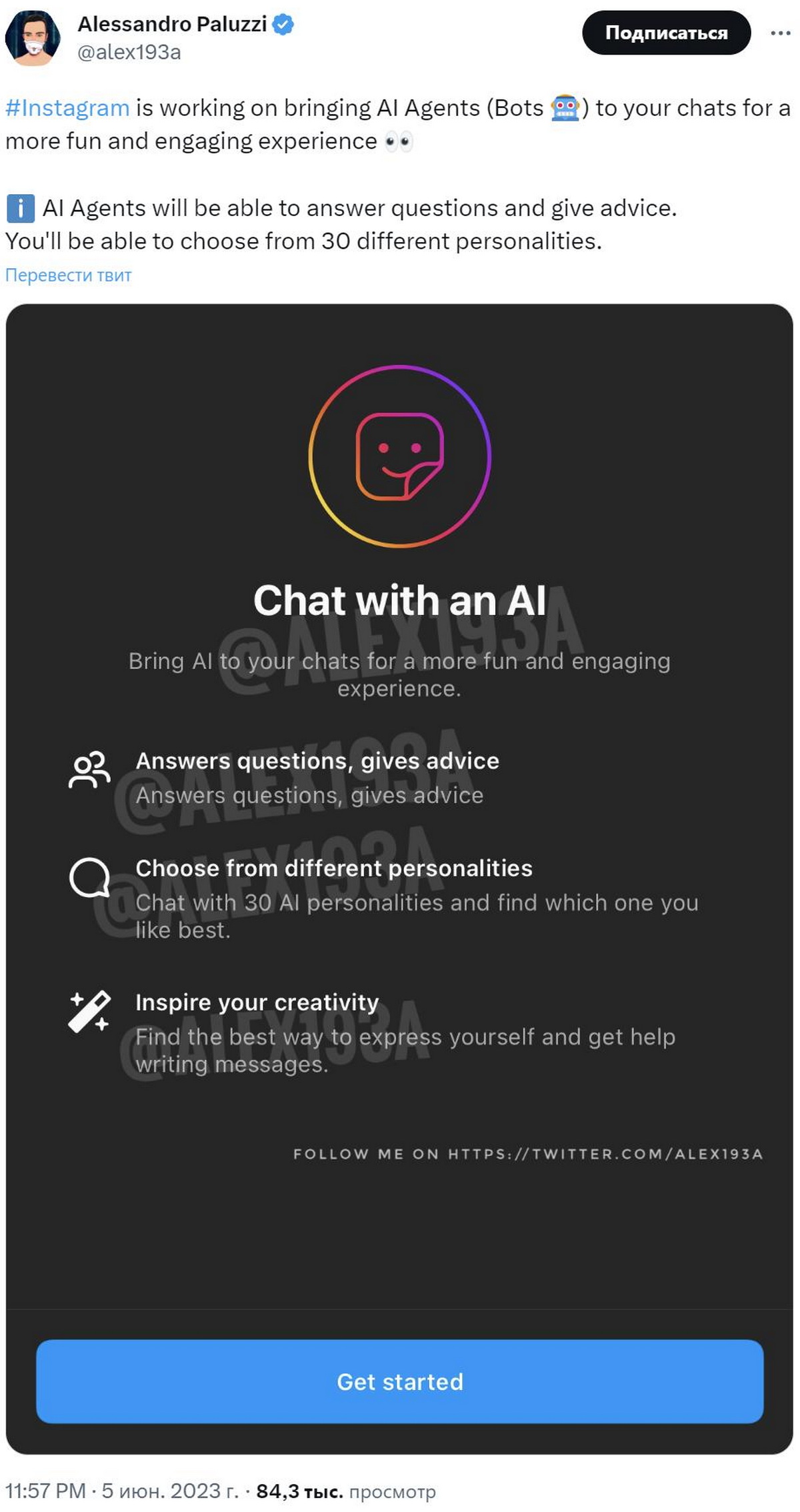 Впервые о возможном появлении чат-бота в продуктах Meta в начале июня сообщил известный техноблогер Алессандро Палуцци. Он обнаружил, что в Instagram появилась новая функция Chat with an AI (Общение с ИИ). В описании новинки говорилось, что чат-бот сможет отвечать на вопросы и давать советы в стиле 30 различных ИИ-личностей, а также помогать пользователям составлять сообщения.
