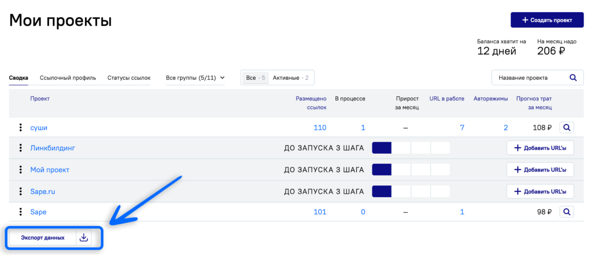 Обратите внимание: в зависимости от числа проектов и количества ссылок в них, файл экспорта может создаваться до 15 минут. Готовые выгрузки хранятся 30 дней.