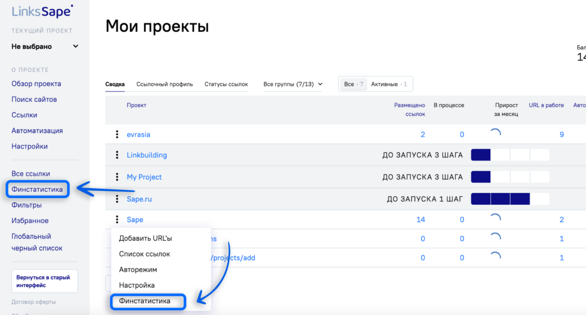 4. Финстатистика. Чтобы быть уверенным, что стратегия продвижения выбрана верно, необходимо отслеживать весь объем статистики по сайтам, в том числе — затраты денежных средств. Раздел «Финстатистика» позволяет анализировать траты по всем проектам в системе.