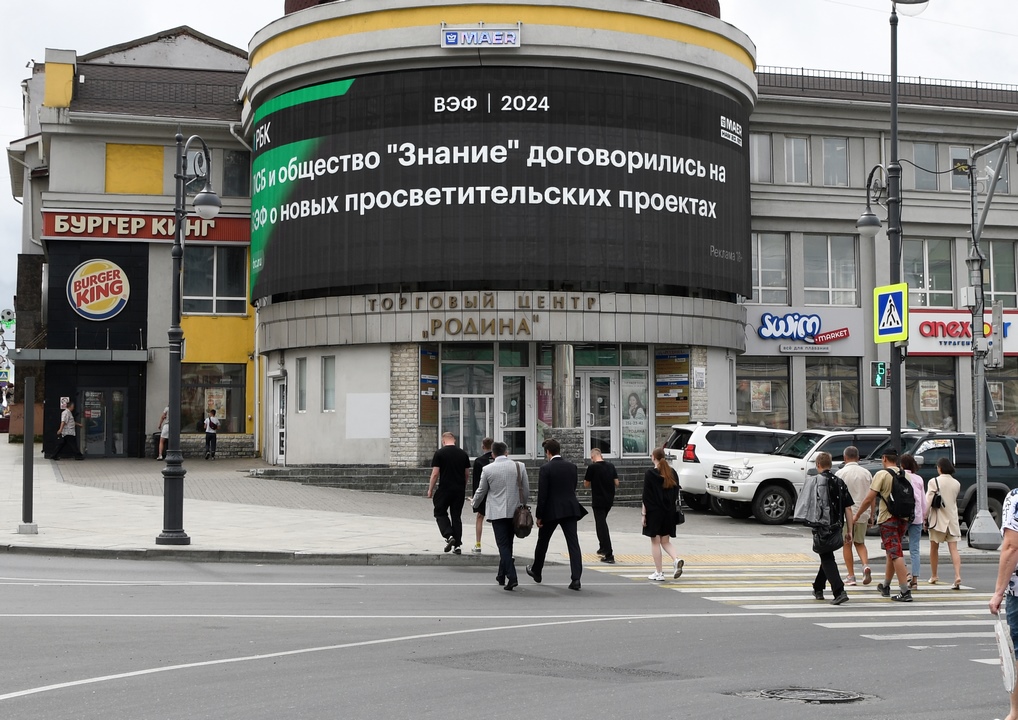 Главные новости Восточного экономического форума транслируют на цифровых экранах и медиафасадах по всей России. Анонсы, ключевые цитаты и информацию о важных решениях, принятых на ВЭФ, увидят свыше 300 миллионов раз. Напомним, главная тема форума в 2024 году — «Дальний Восток — 2030. Объединим усилия, создавая возможности». Деловая программа разделена на семь тематических блоков: «Новые контуры международного сотрудничества», «Технологии независимости», «Финансовая система ценностей», «Россия дальневосточная», «Люди, образование и патриотизм», «Транспорт и логистика: новые маршруты» и «Мастер-планы: от архитектуры к экономике».