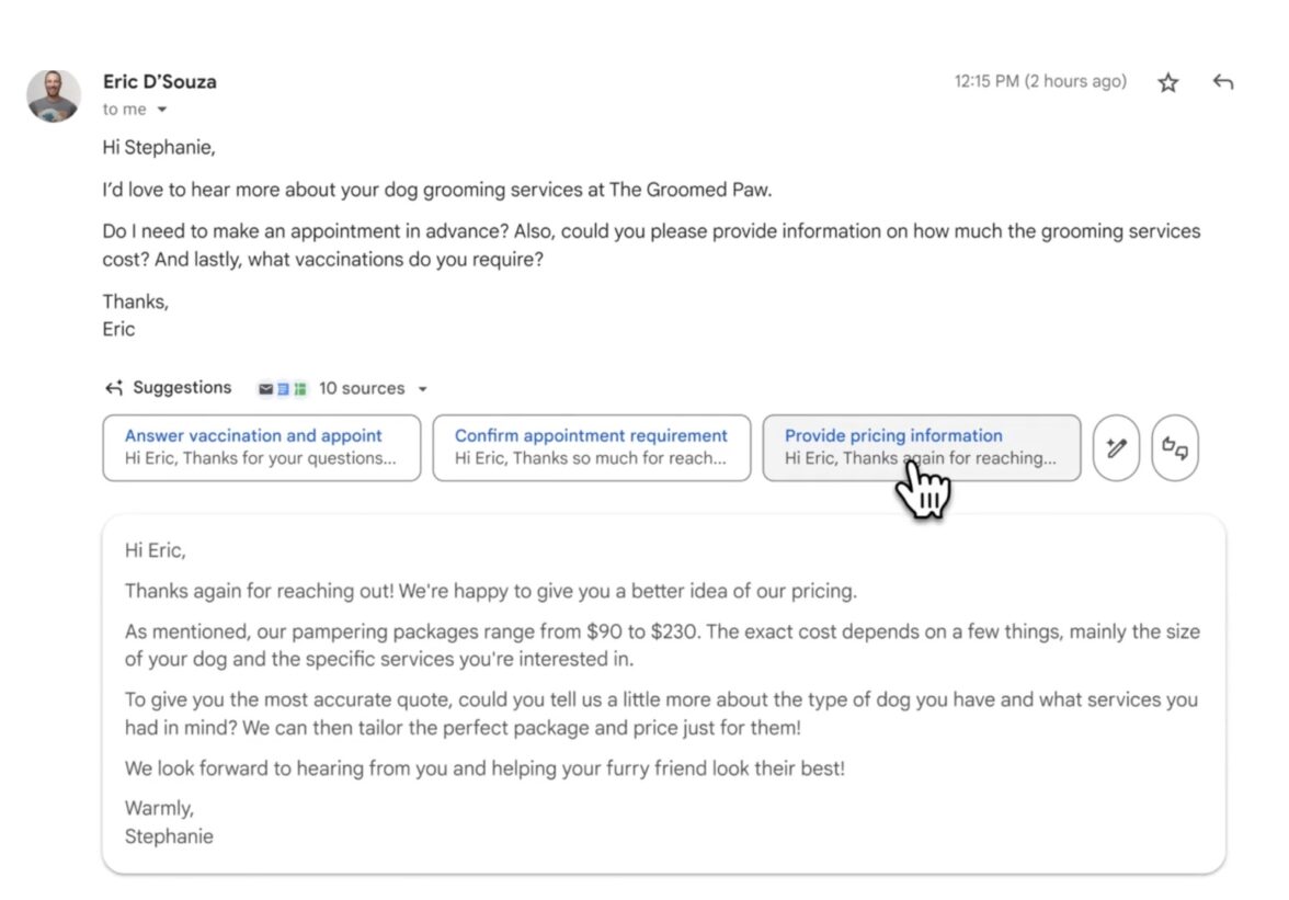 Новые возможности предоставит Google пользователям электронной почты Gmail. Функция интеллектуальных ответов, использующая ИИ для предложения вариантов ответа на письма, теперь будет копаться в почтовом ящике и на Google Disk пользователя, чтобы лучше имитировать его стиль письма. Также будет учитываться, каким тоном нужно отвечать — начальнику, например, более формально. Функция будет доступна на английском языке в интернете, iOS и Android после того, как появится в Google Labs в июле.