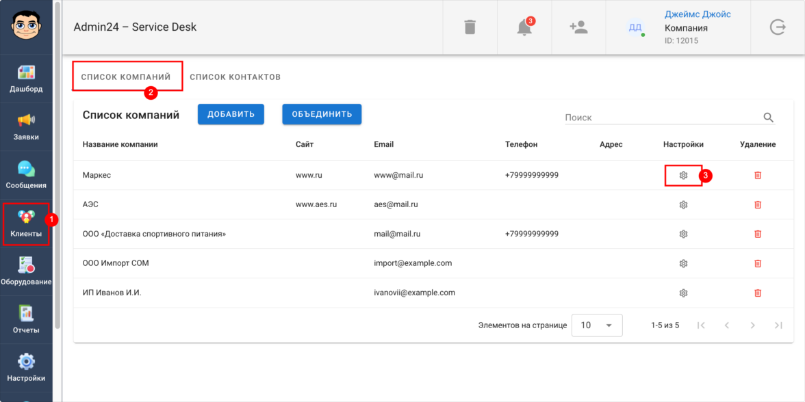 Чтобы настроить затраченное время у компании, перейдите во вкладку «Клиенты» → «Список компаний», нажмите на значок шестеренки напротив названия нужной организации.