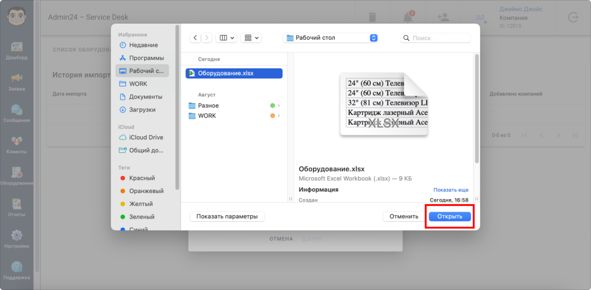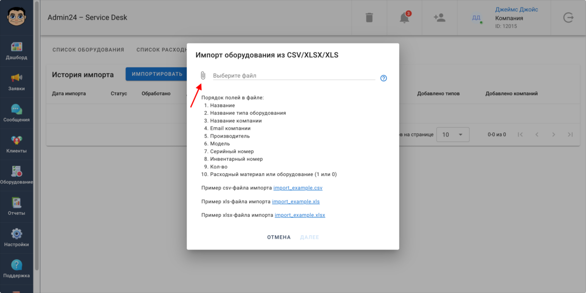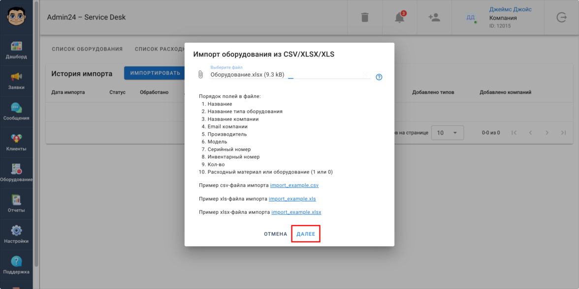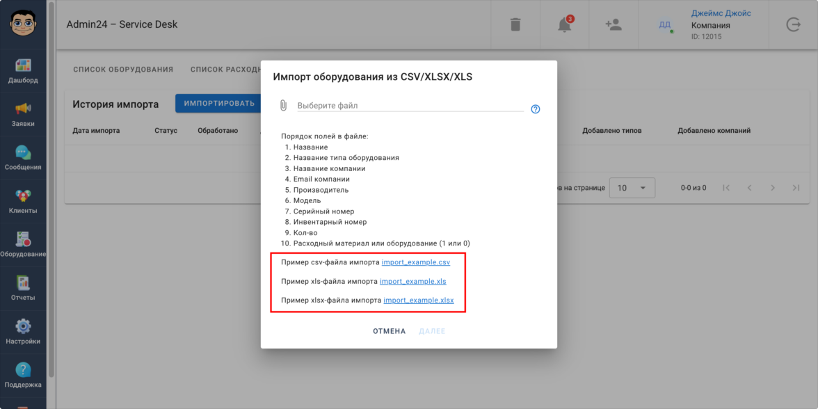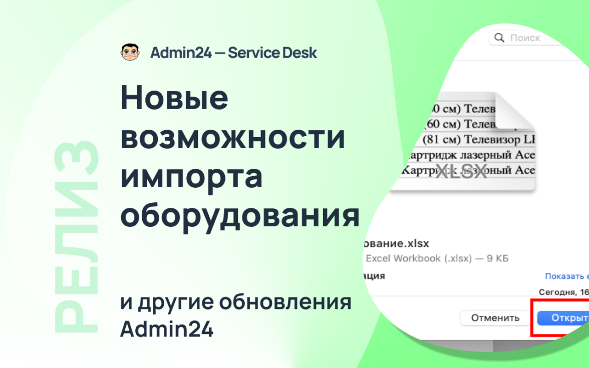 Пользователи Admin24 теперь могут загружать оборудование из файлов в форматах XLSX и XLS.